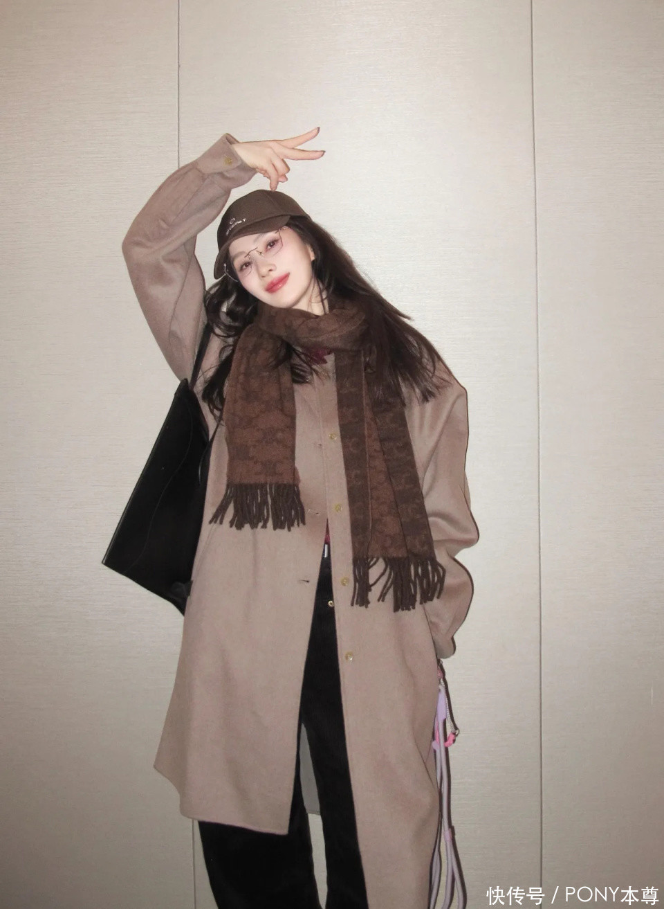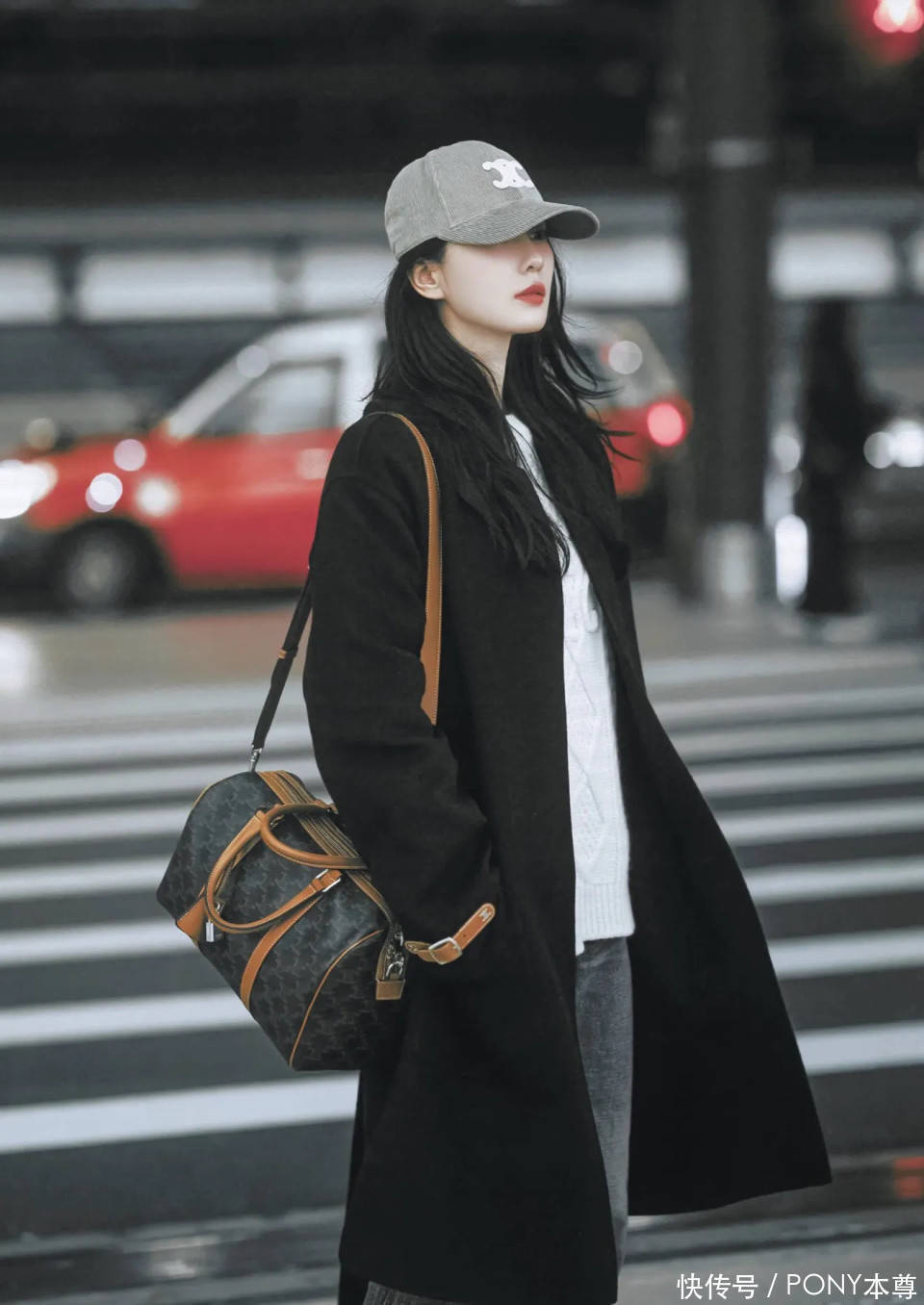 棕色大衣+黑色牛仔裤!棕色调的大衣一直是春秋流行的款式,刘诗诗身上这种色调的棕色对于亚洲女性来说更友好,搭配一条咖啡色印花围巾,头戴棒球帽,有一种巧克力一般的温柔质感!下半身搭配黑色牛仔裤,时髦又减龄!